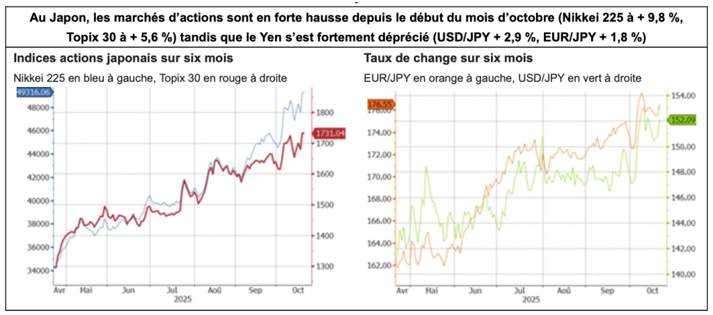 La réaction des marchés japonais (hausse des actions, dépréciation du change) fait suite à l’évolution des anticipations vers davantage de relance budgétaire et le pari d’une BoJ désormais moins encline à remonter son taux directeur compte tenu des orientations économiques du nouveau gouvernement malgré la dérive actuelle des prix (inflation à 2,7 % en août 2025).