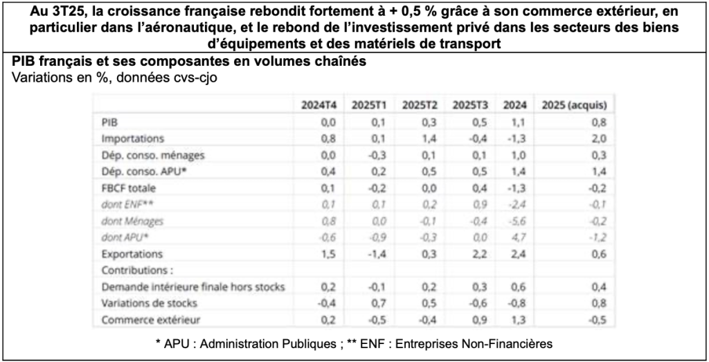 . Ce constat fait également écho à la croissance du PIB au 3T25 en Zone Euro, publiée le 30/10 et ressortie à + 0,2 %, un élément relaté par Christine Lagarde qui souligne notamment la meilleure performance de la France (cf. ci-dessous).