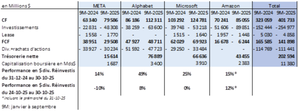 - Les actionnaires ont donc 25 Mds$ de moins de flux disponible sur les 9M-25 par rapport aux 9M-24. Amazon puise dans sa trésorerie pour soutenir ses investissements et ne fait aucun retour à l’actionnaire. Le FCF** de META baisse et le verse dans son intégralité aux actionnaires. La société Microsoft plus prudente dans l’allocation de son capital est la seule des 4 à voir son FCF progresser significativement, sans le reverser entièrement à l’actionnaire.