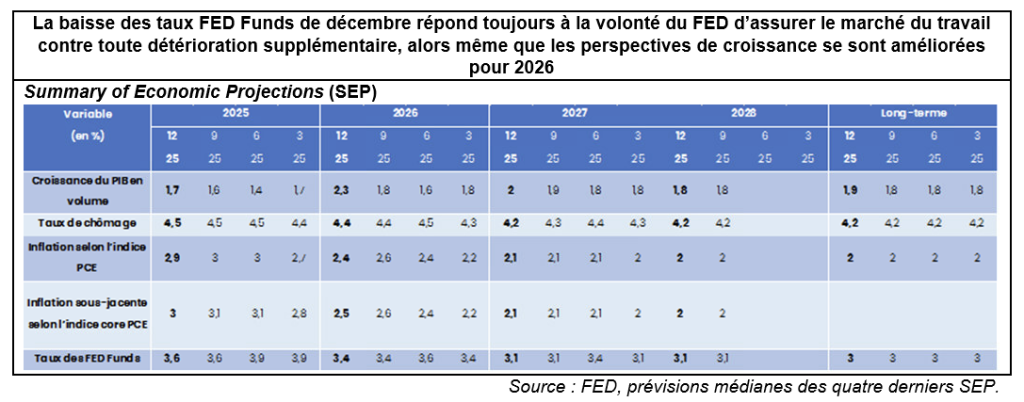 - S’il fallait simplement expliquer les raisons de la nouvelle baisse des taux FED Funds de 25 pbs décidée à l’issue du FOMC du 09/10 décembre 2025, nous opterions pour l’argument suivant, avancé par J. Powell au cours de sa conférence de presse : compte tenu de la difficulté de la situation, où la réalisation du double mandat de stabilité des prix (inflation à 2 %) et de maximisation de l’emploi apparaît impossible car nécessitant des approches contradictoires (hausse des taux pour le premier, baisse pour le second), mieux vaut se rapprocher du taux neutre.
