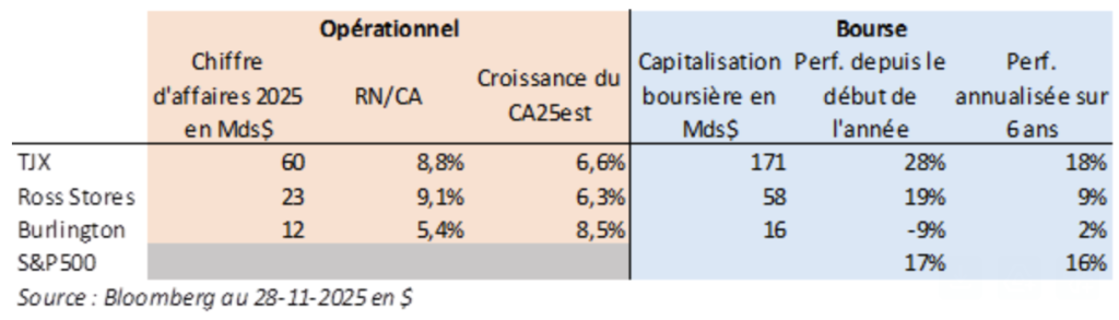 o Le premier est que l’ensemble des ménages américains ont vu leur pouvoir d’achat comprimé depuis 2021, lié à la forte hausse des prix et des taux d’intérêts. Et ces trois enseignes s’adressent à l’ensemble des ménages. La hausse des droits de douane explique en partie l’accélération de la croissance à magasin comparable pour Ross Stores et TJX sur le 2ème semestre 2025 (>5%). C’est d’ailleurs sans doute l’élément principal qui a déçu les investisseurs dans la publication de Burlington avec 1% de croissance à magasin comparable au 3èmetrimestre.