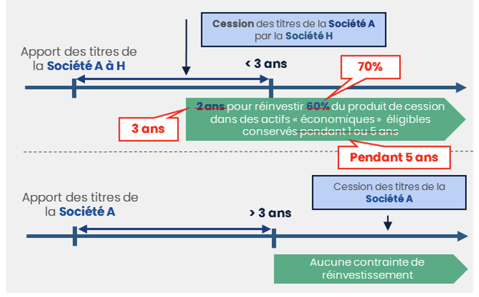Cependant, ce report d’imposition peut prendre fin et entraîner l’imposition de la plus-value, notamment en cas de cession des titres apportés dans un délai de 3 ans à partir de la date de l’apport, si la société bénéficiaire de l’apport ne respecte pas des conditions de réinvestissement du prix de cession. - La loi de finances pour 2026 modifie sur plusieurs points les conditions de réinvestissement à respecter pour le maintien du report d’imposition.