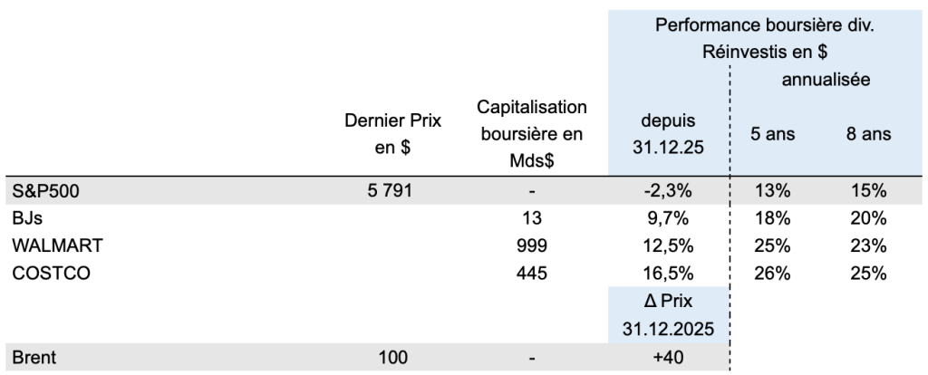 - D’un point de vue boursier, les investisseurs considèrent Costco comme une valeur de grande qualité qui ne leur réserve pas de mauvaise surprise. Elle est un fond de portefeuille solide. La valorisation est riche (46x les bénéfices estimés pour les 12 prochains mois). Toutefois nous pensons qu’elle est cohérente avec la croissance attendue des bénéfices supérieure à 10%/an, un bilan sain (13 Mds$ de trésorerie nette prévu fin 2026) et l’espoir d’accélération dans un contexte où le prix du pétrole s’est fortement renchérit.