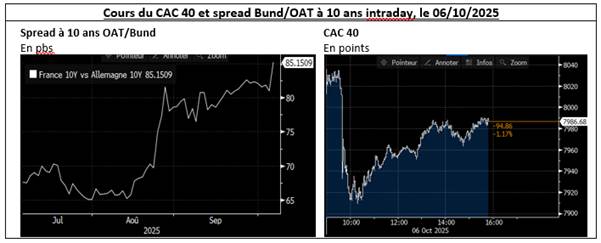 Unsurprisingly, the announcement of Lecornu’s resignation sent the CAC 40 into a downward spiral, driven in particular by stocks exposed to the French sovereign (utilities, financials) on the one hand, and on the other hand, the opening of the 10-year Bund/OAT spread beyond 85 bps (see below).