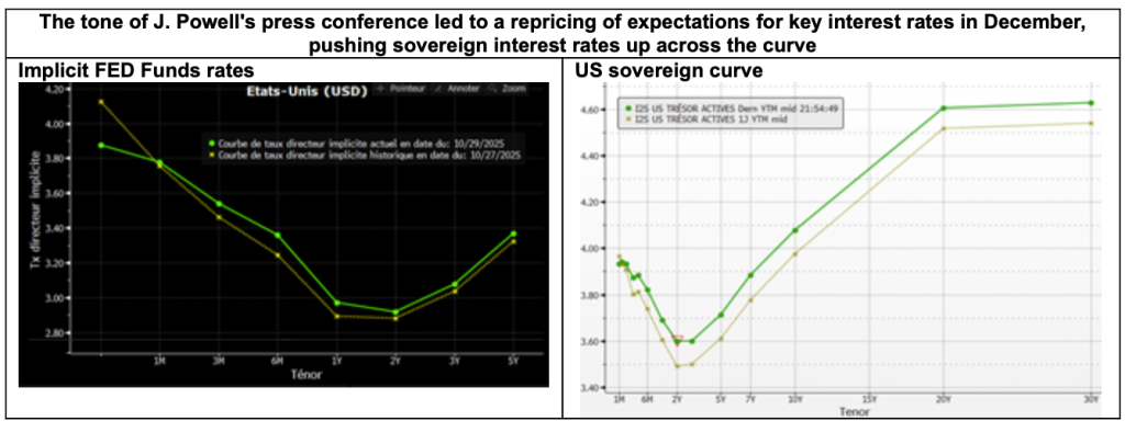 The FOMC’s October decisions and the shift in tone of J. Powell’s press conference remarks come as no surprise to us. We continue to believe that US economic activity is robust, driven not only by massive ongoing investments in AI, but also by a resilient consumption, even if it is mainly driven by the wealthiest households. The outlook is also good for 2026, with expectations of the OBBBA fiscal stimulus, not to mention hopes of easing global trade tensions, industrial relocations and direct investments resulting from the various trade agreements signed this year.