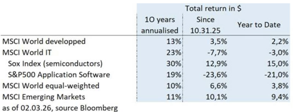 - However, behind this apparent calm on the stock market, the information technology sector, which accounts for 25% of the MSCI World Index, is experiencing a major stock market disruption. The digital services sector, i.e., application software, IT consulting, and professional publishing companies, is falling sharply on the stock market. More specifically, the S&P 500 application software sector (which includes for example Microsoft, Oracle, and Salesforce) has fallen 21% since the beginning of the year, while the semiconductor sector (represented by the Sox Index) has risen 15%. On the other hand, the private valuations of Anthropic and xAI are approaching $500 billion, and even $1 trillion for OpenAI, compared to $3 trillion for Microsoft.