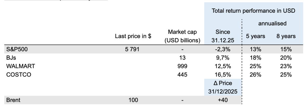 -  From an investment perspective, investors view Costco as a high-quality stock that is unlikely to deliver any unpleasant surprises. It is a solid core holding. The valuation is rich (46x forward 12-month earnings). However, we believe this is consistent with expected growth earnings growth in the mid-teens per year, a healthy balance sheet (projected $13 billion in net cash by the end of 2026), and the prospect of accelerated growth in a context where oil prices have risen sharply.